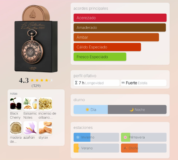 🌸 Notas: cereza negra, azafrán, incienso, notas balsámicas, styrax, maderas preciosas y cuero.